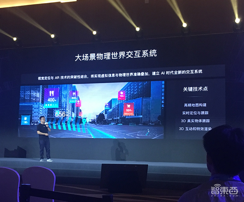 除了跟人和身边物体的互动,百度还研发了更大范围的对整个物理世界的一个互动系统,创新性的将大范围3D视觉定位技术与AR技术结合,将上线虚拟信息和物理世界精准叠加。这一功能已在百度地图上线、软硬件结合