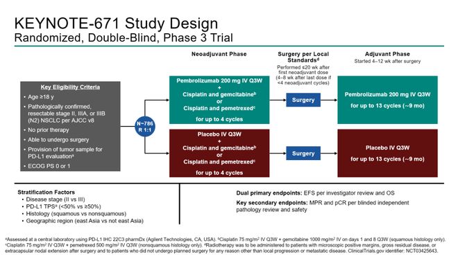 在本届ESTS大会上,美国胸外科协会(AATS)现任主席、来自纪念斯隆-凯特琳癌症中心(MSKCC)的David R. Jones教授报告了KEYNOTE-671研究中II期患者的第三次期中分析(IA3)结果。在KEYNOTE-671研究中,有239例II期非小细胞肺癌(NSCLC)患者被随机分配到新辅助帕博利珠单抗联合化疗+手术+辅助帕博利珠单抗治疗组(n=118)或新辅助安慰剂联合化疗+手术+辅助安慰剂治疗组(n=121)[7]。