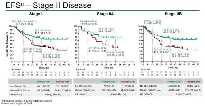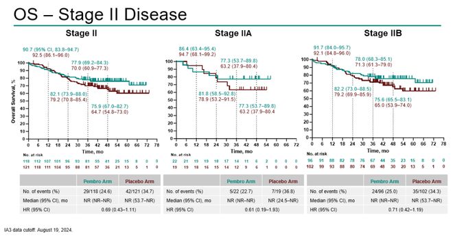数据截至2024年8月19日,中位随访41.1个月(范围:0.4个月~75.3个月)。对II期患者进行的IA3分析结果显示,在新辅助治疗后行手术治疗的患者中,帕博利珠单抗组、安慰剂组分别有94.9%(94/99)、86.4%(89/103)的患者实现了R0切除。与安慰剂组相比,疗效结果支持新辅助帕博利珠单抗联合化疗+手术+辅助帕博利珠单抗治疗II期NSCLC患者[中位无事件生存期(EFS):帕博利珠单抗组为未达到vs安慰剂组为24.4个月;两组中位总生存期(OS)均为仍未达到][7]。