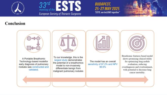 广州医科大学附属第一医院(国家呼吸医学中心)何建行教授团队在本届ESTS展示了两项研究成果。其中一项多中心前瞻性研究验证了基于便携式微型气相色谱技术(μGC-μPID)的呼气组学可作为灵敏的早期肺癌无创筛查工具。该研究是本届ESTS大会INNOVATIVE/EXPERIMENTAL专题的报告之一[3]。