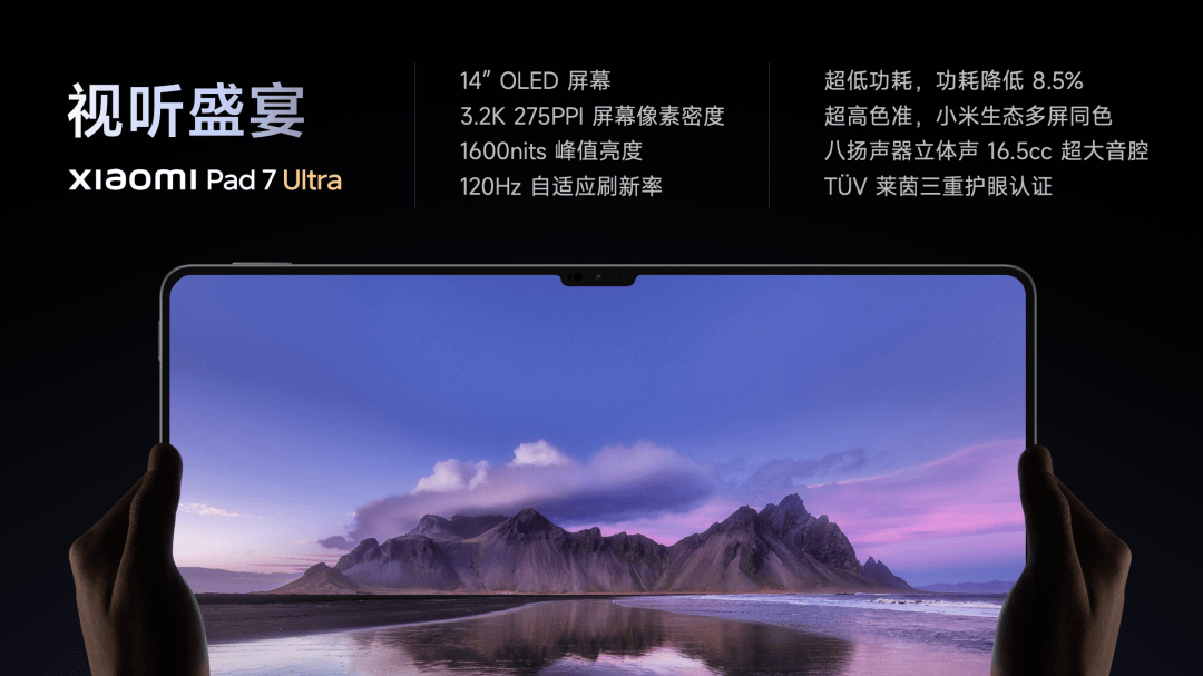 小米平板7 Ultra 配备旗舰八扬声器、16.5cc 超大音腔腔体体积、4 组高功率功放独立驱动。支持四声道沉浸环绕声,用这款平板看电影、听音乐,相信能为大家带来一场视听盛宴。