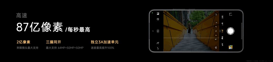 首先,是高速高画质的旗舰影像体验,每秒最高可以同时处理 87 亿像素,并且内置独立 3A 加速单元,自动对焦、自动曝光、自动白平衡这些关键性能指标,最高可以提速 100%。