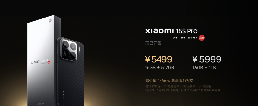小米15S Pro 一共有两款配置,16GB+512GB 售价 5499 元,16GB+1TB 售价 5999 元,可以享受国补,现在购买还额外赠送 1366 元的尊享权益,包含碎屏保、电池盖保、电池保和一年的只换不修。