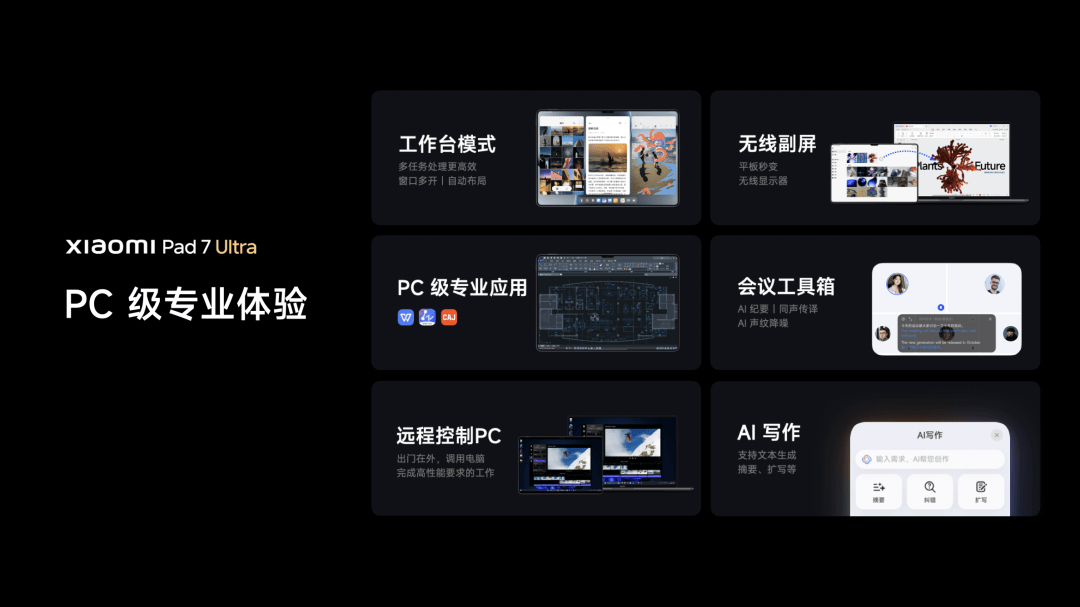 小米平板7 Ultra 拥有专业 PC 级办公能力,工作台多任务操作能够多窗口自动布局,非常高效。支持 PC 级的 WPS、CAD、CAJ 专业软件,还能远控 PC、作为电脑副屏使用。苹果生态也特别友好,支持苹果办公套件,如 Numbers、Keynote、Pages,以及苹果设备文件、图片互传。