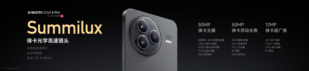 小米Civi 5 Pro 搭载徕卡 Summilux 全焦段高速镜头,拥有更大的进光量和卓越的光学素质。