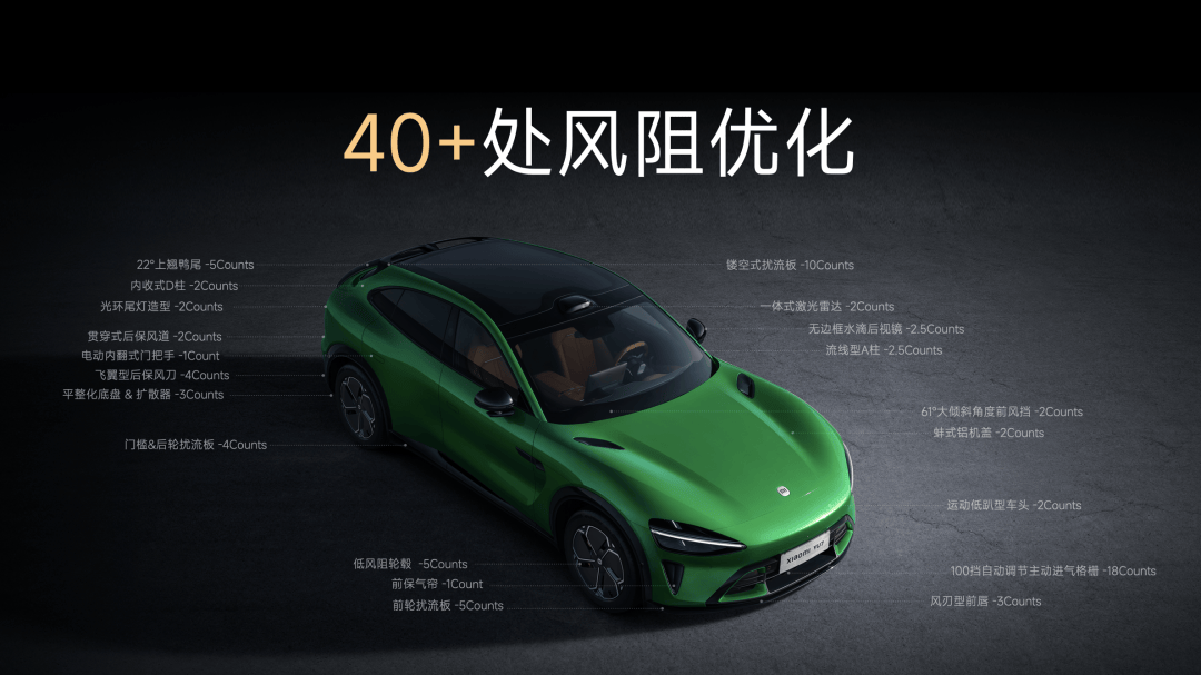 小米YU7 全车做了 40 多处风阻优化,风阻系数优化到 0.245,相当于 CLTC 续航增加 59km。还拥有 10 组贯穿式风道、19 个风口来梳理全车气流。