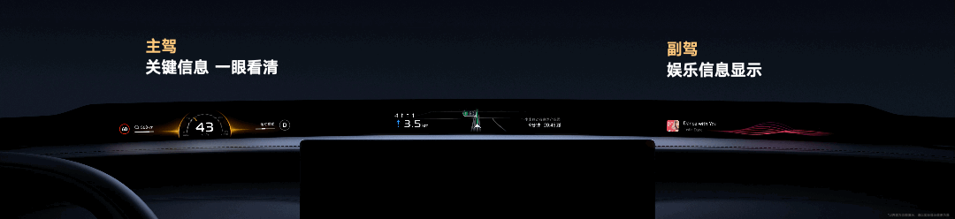 它有什么好处呢?首先,它是一个符合直觉的交互系统,你在开车时,最重要的信息,比如时速、导航,可以一眼看清,副驾还能同时显示娱乐信息。