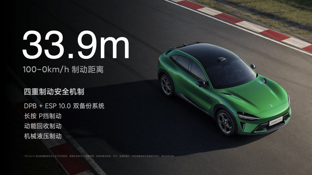 从 100-0km/h 最短制动距离 33.9m,这个刹车距离媲美百万跑车级的制动能力。小米YU7 还拥有四重制动安全机制,能带来更稳定、更安全的制动性能。