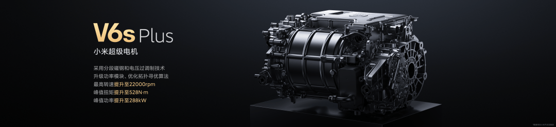 小米YU7 双电机全轮驱动版本,最大马力 690PS、峰值功率 508kW,这么强大的性能,背后是小米超级电机 V6s Plus,转速提升到 22000 rpm,扭矩、功率在 V6s 基础上都有进一步提升。
