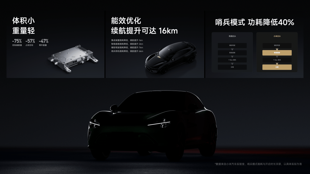 这样的好处是什么呢?首先是控制器数量减少,占用的空间就更小,重量也从 6.85kg 降低到 3.6kg。第二,实现了全链路的能效优化,可以提升超过 16km 续航。举一个例子,当你开启哨兵模式后,如果车经常被围观,哨兵模式就会比较费电,但当高度集成之后,车内通讯链路精简,视频信号两步就能上网,哨兵模式的功耗比之前就可以降低 40%。